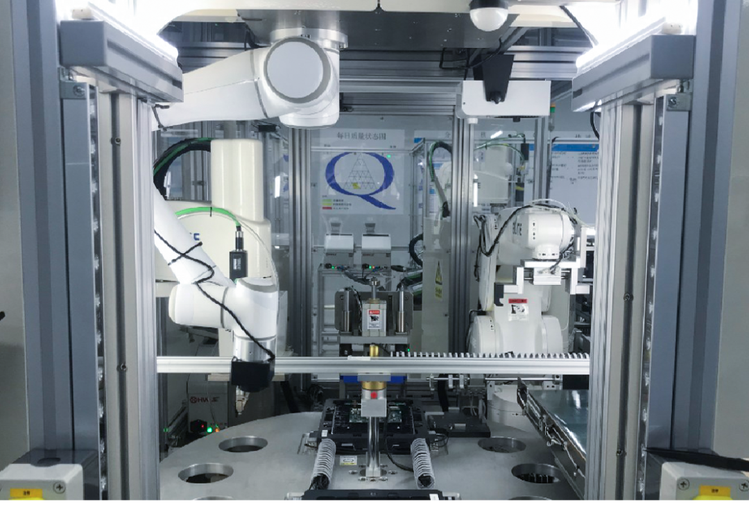 来料的条码读取和装配检查、螺丝拧紧的工位,机器人运行只需平面操作、节拍要求高,则由SCARA机器人执行;物料在不同工站的搬运和装配则由高速的工业六轴机器人进行。