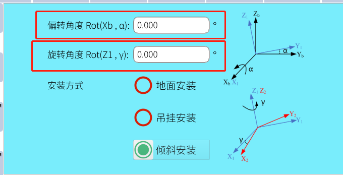 选择倾斜安装时会出现两个参数:偏转角度和旋转角度如下图: