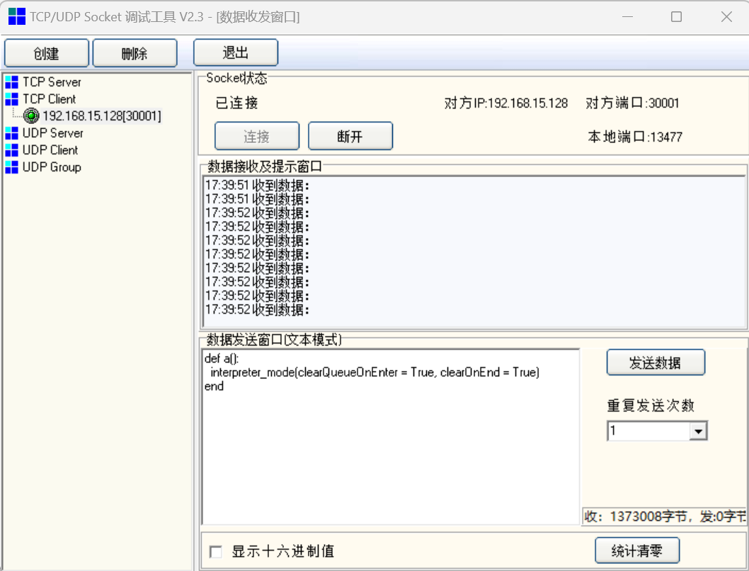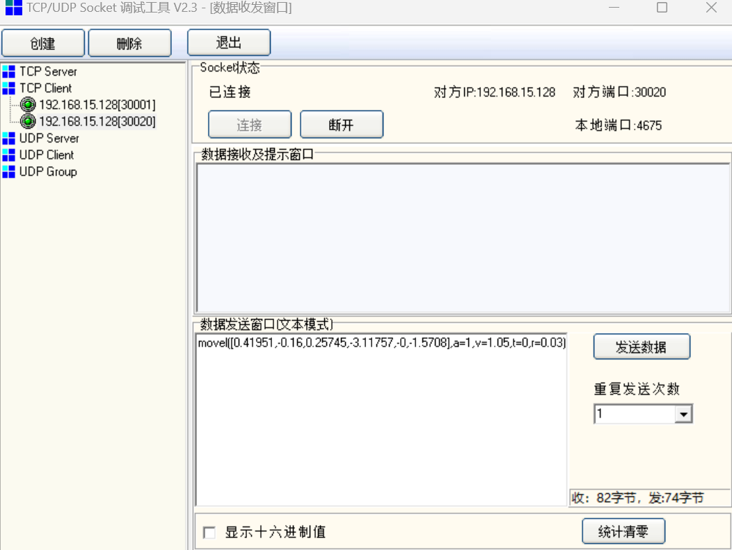 2.  用通讯助手创建一个 30001端口的客户端,连接机器人并发送脚本使机器人进入解释器模式
