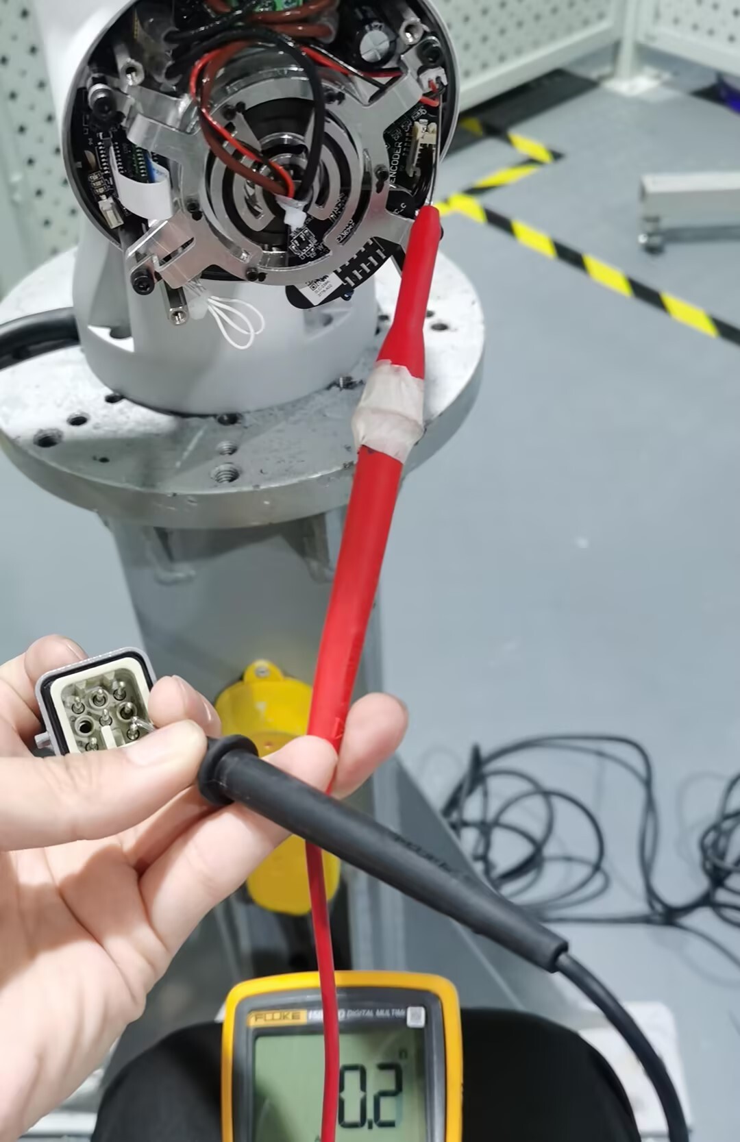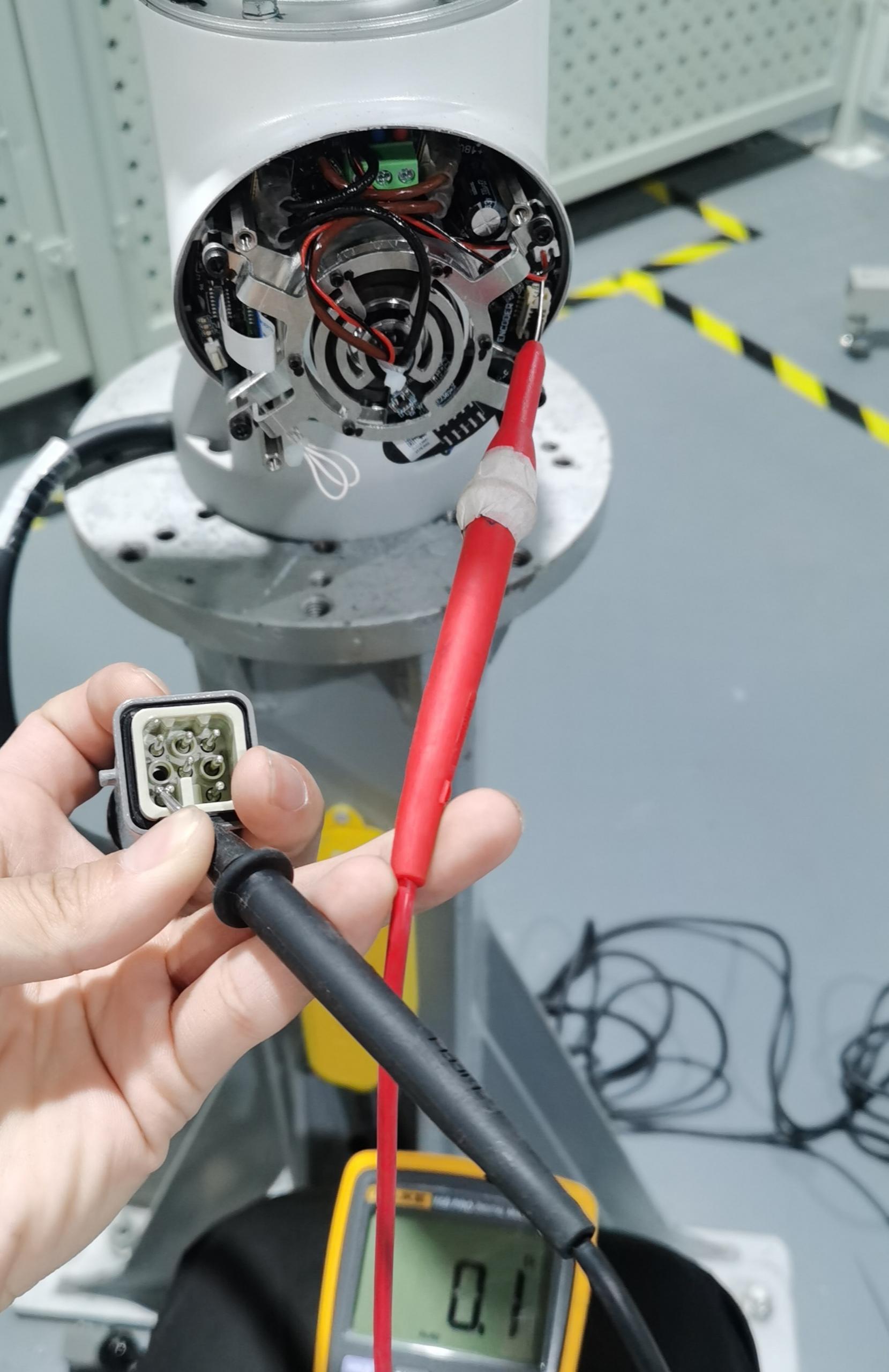 本体与控制柜连接,打开任意关节端盖,万用表打到欧姆档,测量485+与485-电阻是 否在60欧姆左右,偏差太大或太小就有问题.如果有问题,测量两个相邻关节之间单线485+,单线485-的阻值,值在1欧姆左右即可