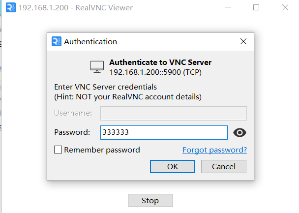 4.  在VncViewer的界面IP输入栏中输入对应机器人的IP地址,回车链接,密码为333333,即可