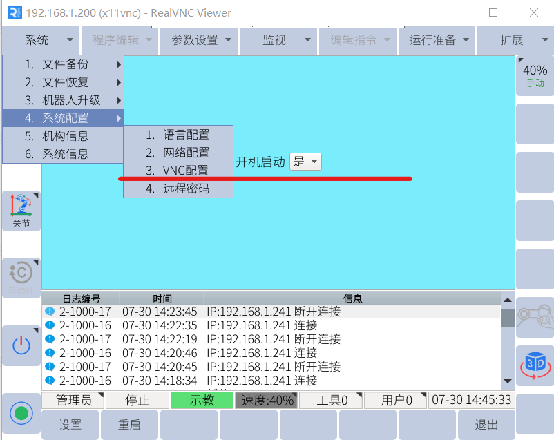3.  机器人侧在系统配置-VNC配置中,修改为开机启动并设置,同时点击启动按键,当示教器窗口出现VNC已启动和VNC设置成功后即可。