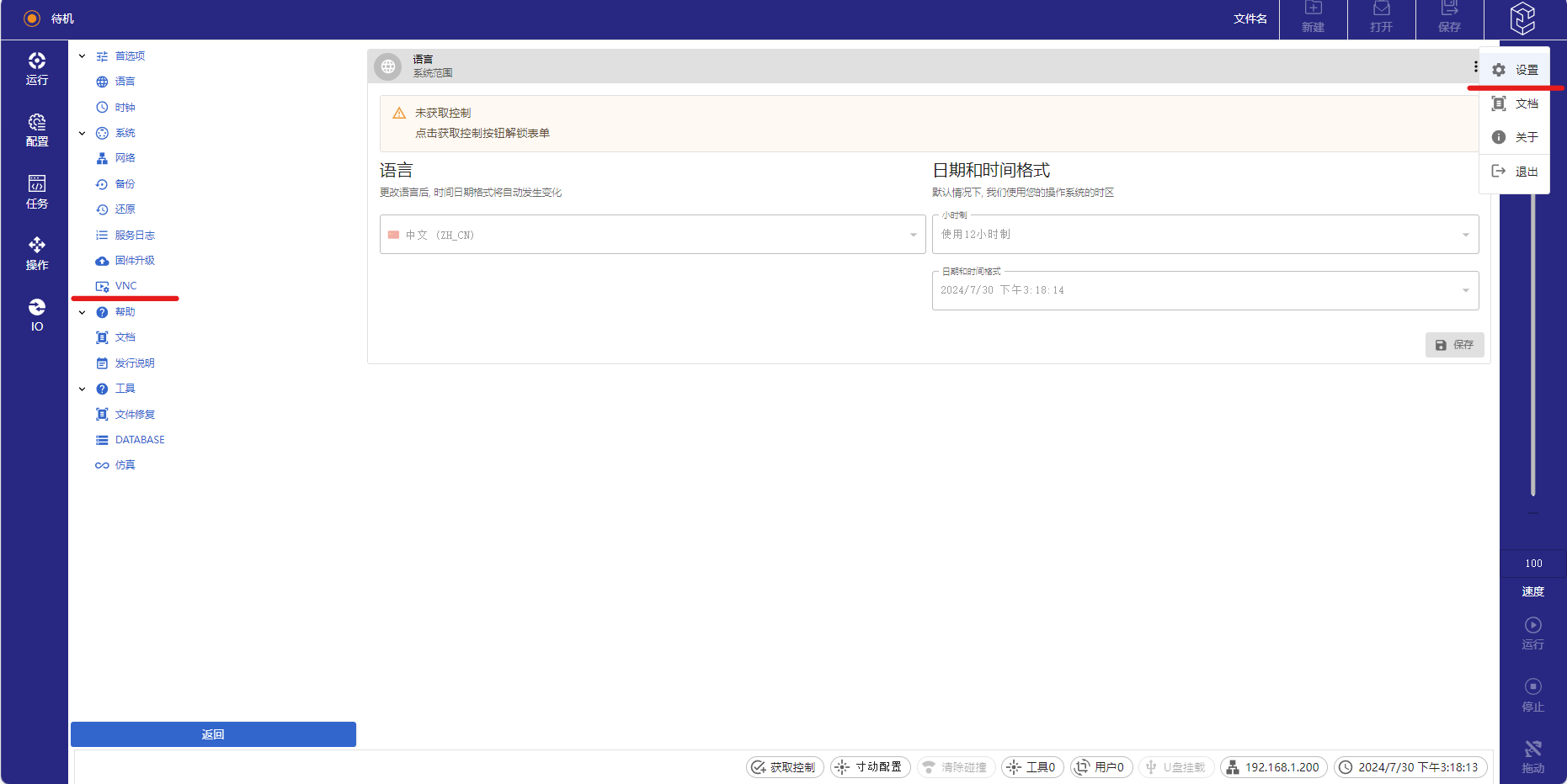 3.12及以上版本开始支持全新的网页示教器,其功能更丰富,若还想在网页示教器使用VNC功能按照如下步骤: 先点击右上角米兰·(milan)中国logo,点击设置,再点击VNC即可进入