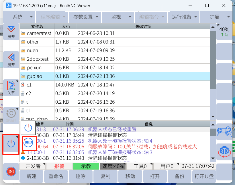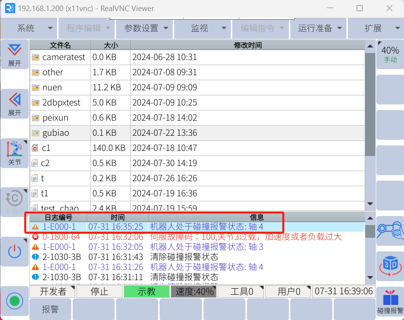 2、伺服故障100为机器人系统报警,如果无法清除报警可先降低或者关闭碰撞报警灵敏度后反向移动机器人脱离卡死。