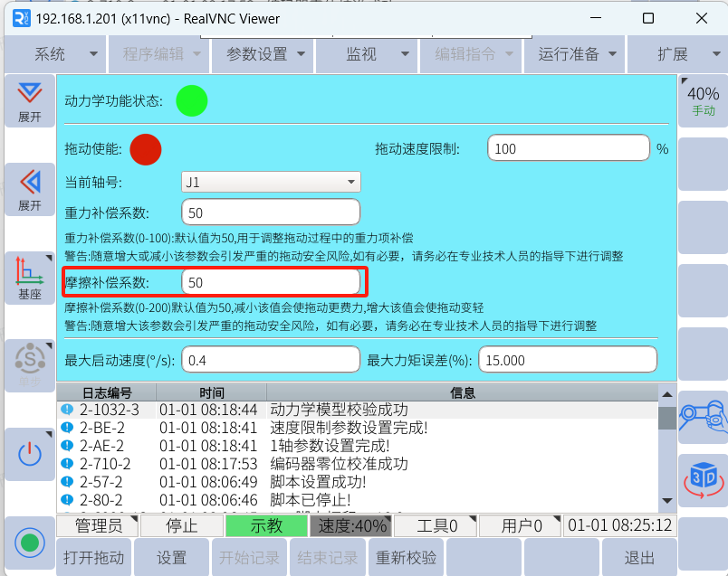 打开拖动,拖动某个关节时感觉摩擦力较大,拖动比较费力,可将该轴的摩擦补偿系数调大,参数值越大,摩擦力越小,拖动越轻松。数值设置的越小,摩擦力越大,拖动越吃力。默认值为 50,建议可设置 60-90 之间,不建议设置到 100,默认50。