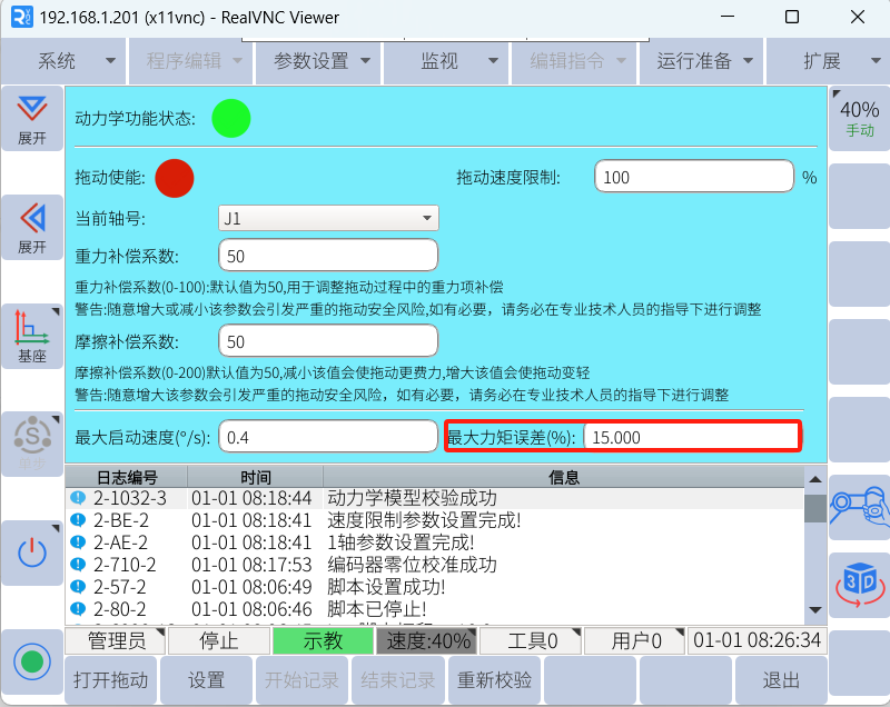 打开拖动后与打开拖动前的力矩差值占打开前力矩的百分比当该百分比大于所设置的百分比时,拖动使能不会被打开且系统提示“力矩校验失败,无法打开拖动”。造成的原因: 安装方式、负载、零位、连杆长度、额定转矩、减速比、机器人类型错误,这需要工程师自行判断。
