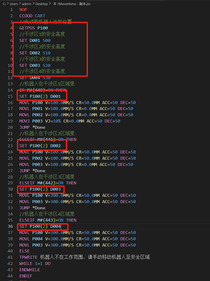 方式一:上升到各个区域上位安全位置高度,需要手动示教各个干涉区的上方安全位