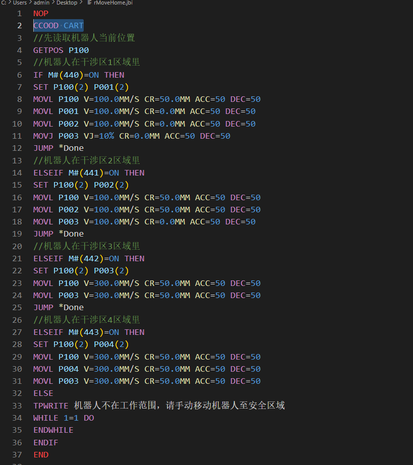 不在干涉区暂时无法规划路径,故不能依靠干涉区回原,若在运行过程中出现机器人停止在干涉区之外且在工作范围之内,需要重新规划相关干涉区