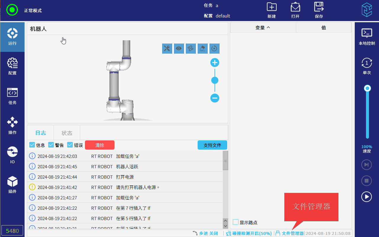 CS机器人示教器软件界面下方内置有文件管理器功能,该功能可以管理程序文件、配置(全局变量)文件和脚本等内部文件,以及可以管理外部存储介质U盘文件;