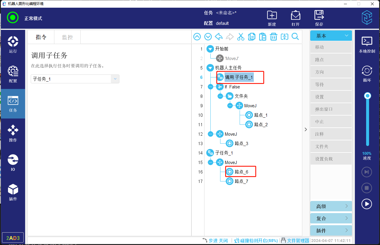 4. 如果程序流程中,存在调用子任务节点,则会进入被调用的子任务内部按照相应规则,查找起始安全位置点位,如图-5所示程序,如果任务从第一行开始运行,则会查找到路点_6作为程序起始位置。