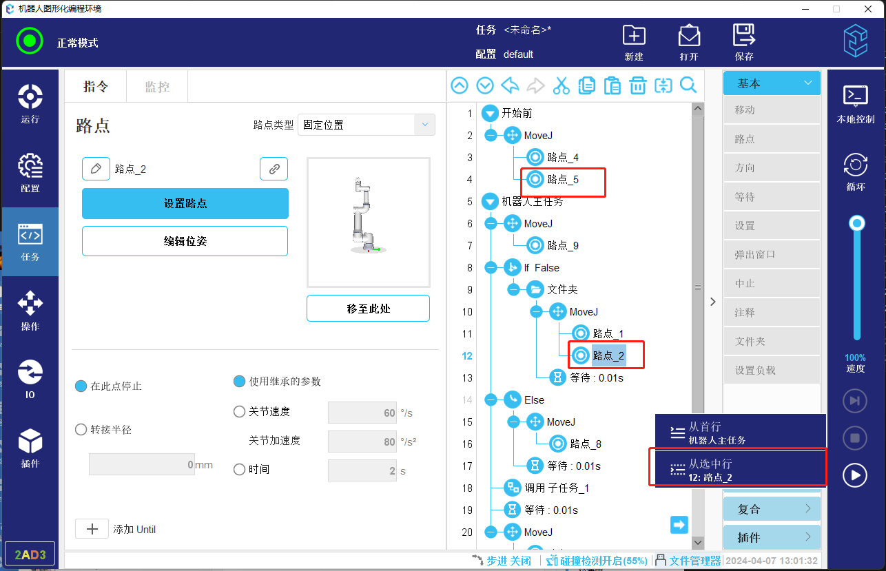 4. 如果当前选中的任务节点上方无可以运行到的节点并且内部也没有可以运行到的点,则会直接开始运行,不再继续向后考虑支持运行到的路点。所以下方图-13所示程序会支持开始运行,不会已路点_4作为起始位置。