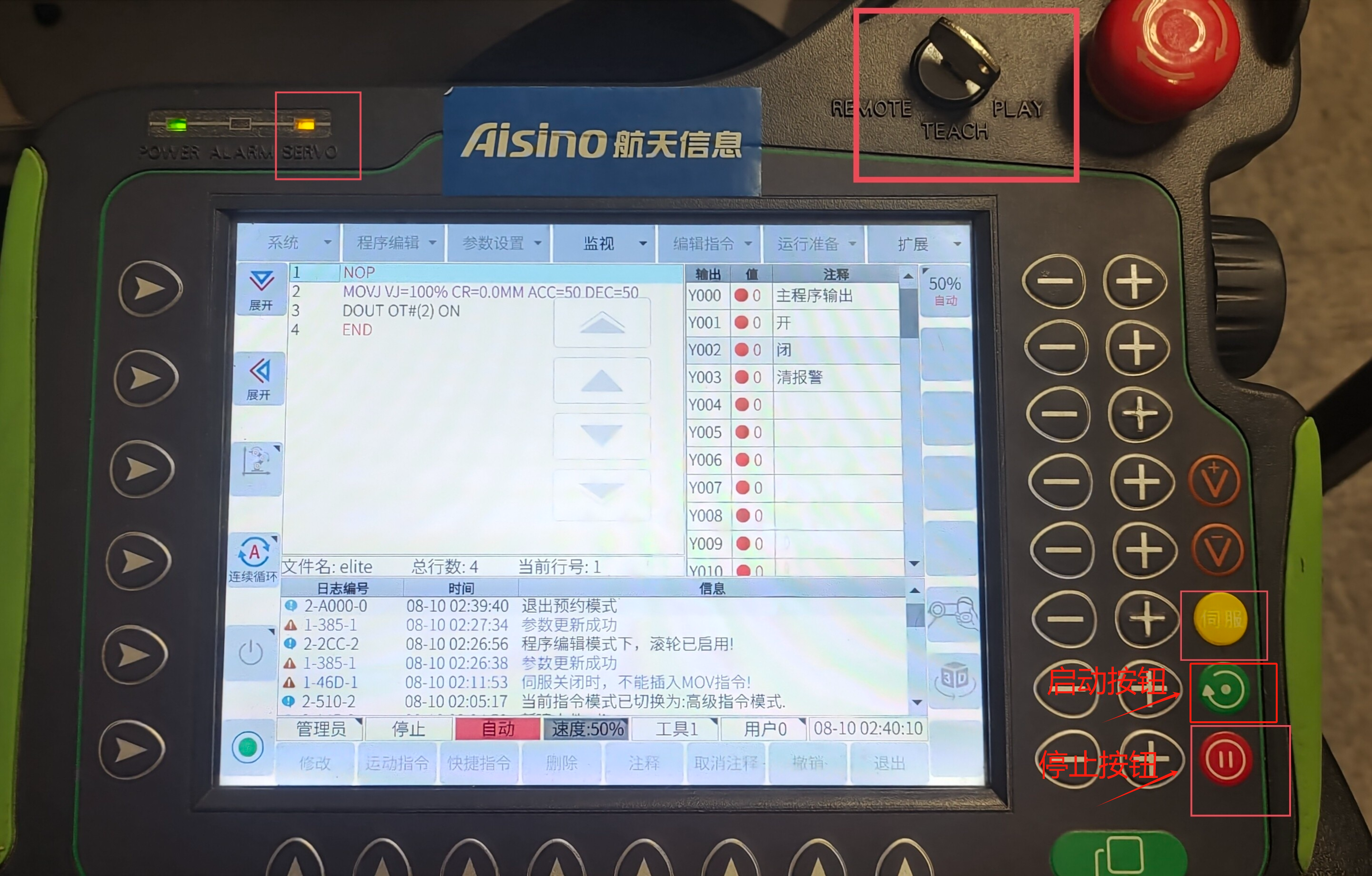 时,SERVO 指示灯亮。按绿色按钮程序启动 , 红色按钮是程序停止。