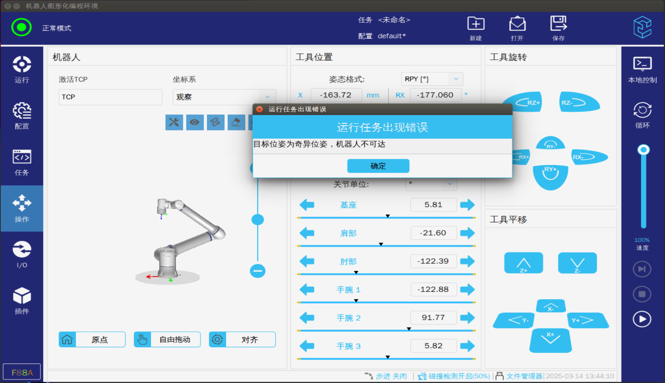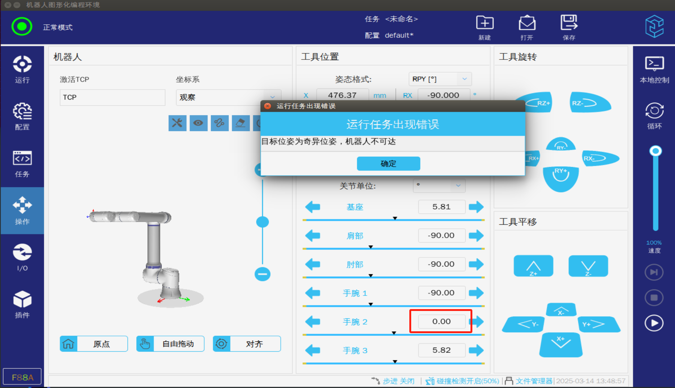 • 机器人进入奇异点时需要使用关节坐标将机器人移出奇异点