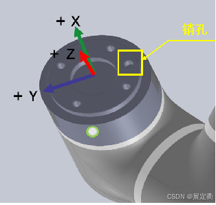 2.  注意安装方向,力控传感器的X,Y,Z方向要与机械臂的工具坐标系方向一致,可以参考下图确认安装方向