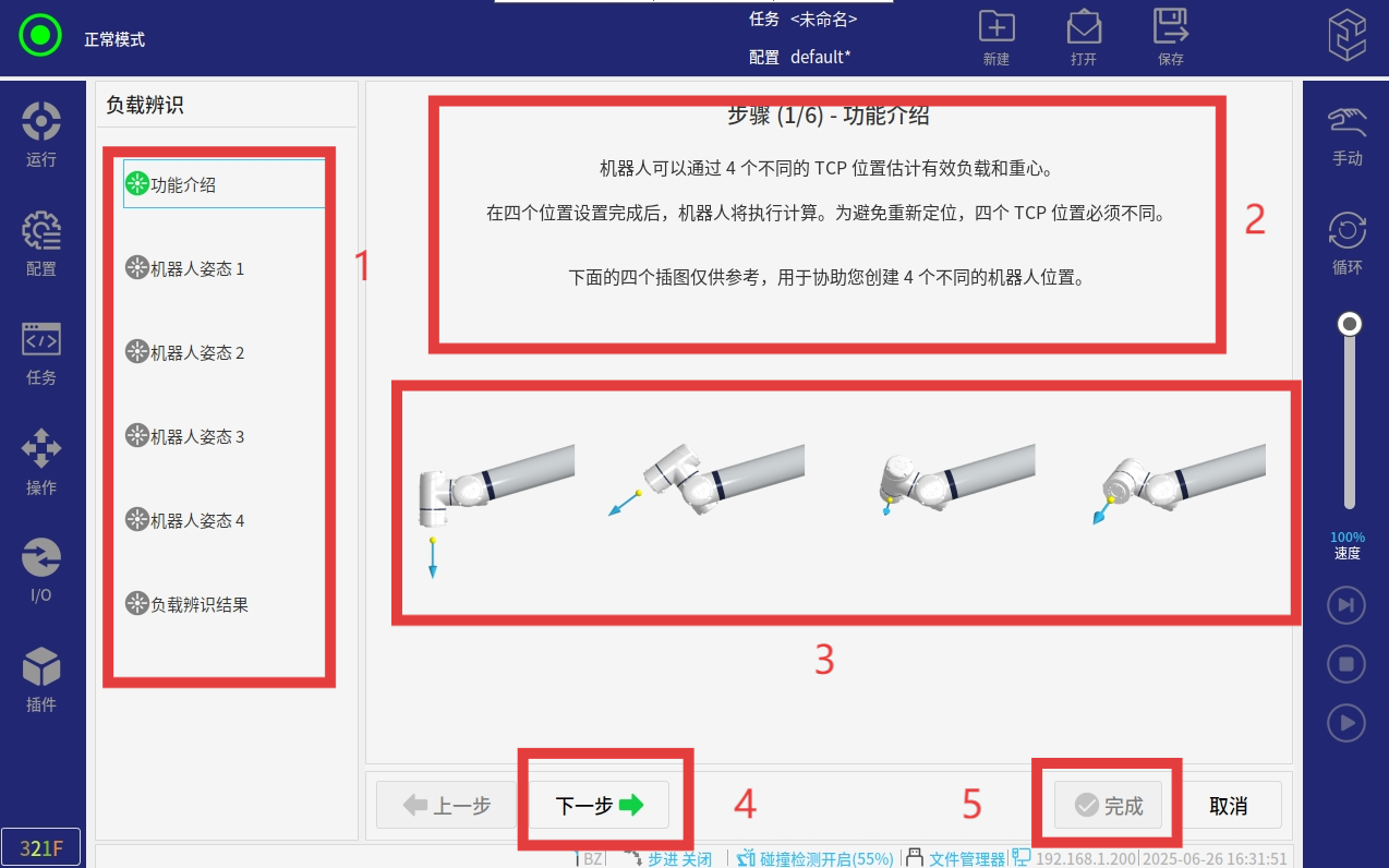 3.  按照下图中所示机械臂位姿,设置4个不同的点位,设置好后点击完成即可。