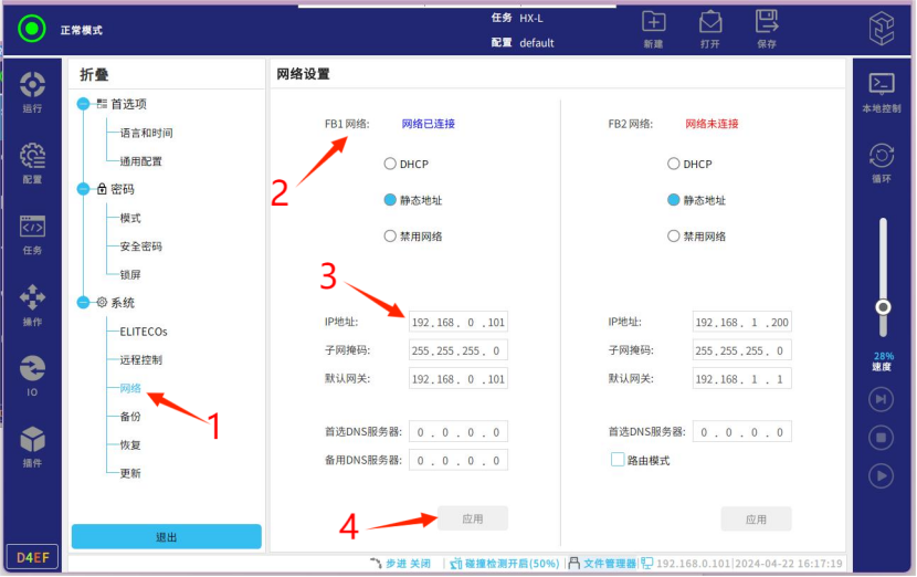 第三步-选择网络——FB1网络(静态地址)——输入(IP地址,子网掩码,默认网关)——点击“应用“(FB1网络显示网络已连接则表示连上,应注意IP网段和电脑对应网段应保持一致)