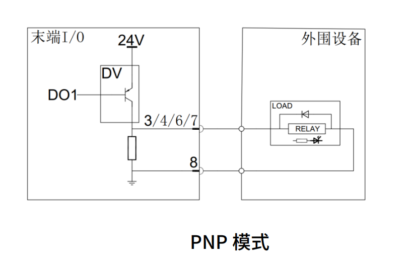 输出接口为 PNP 型输出,支持 1000mA 电流流出。接线方式如图PNP 模式(单针电源模式)所示。