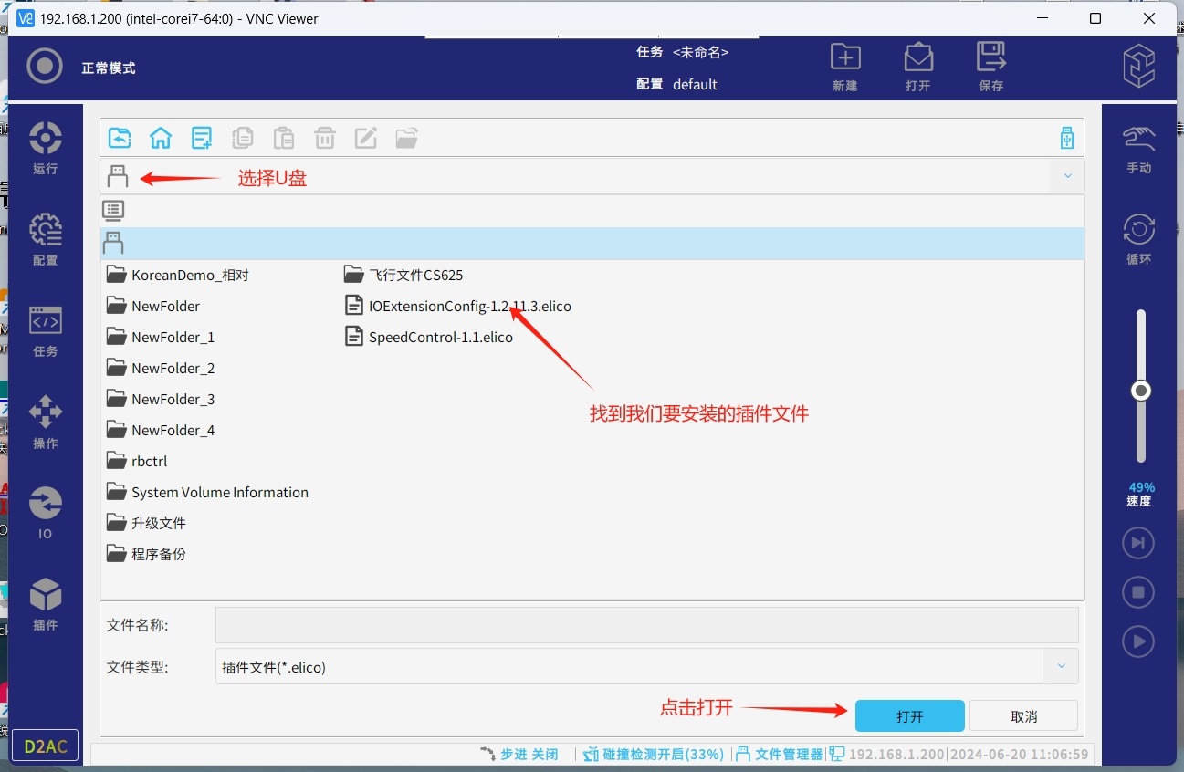 ● 将获取到的插件文件放置到U盘内,并将U盘接入机器人USB接口,按照下方操作安装IOExtensionConfig插件。