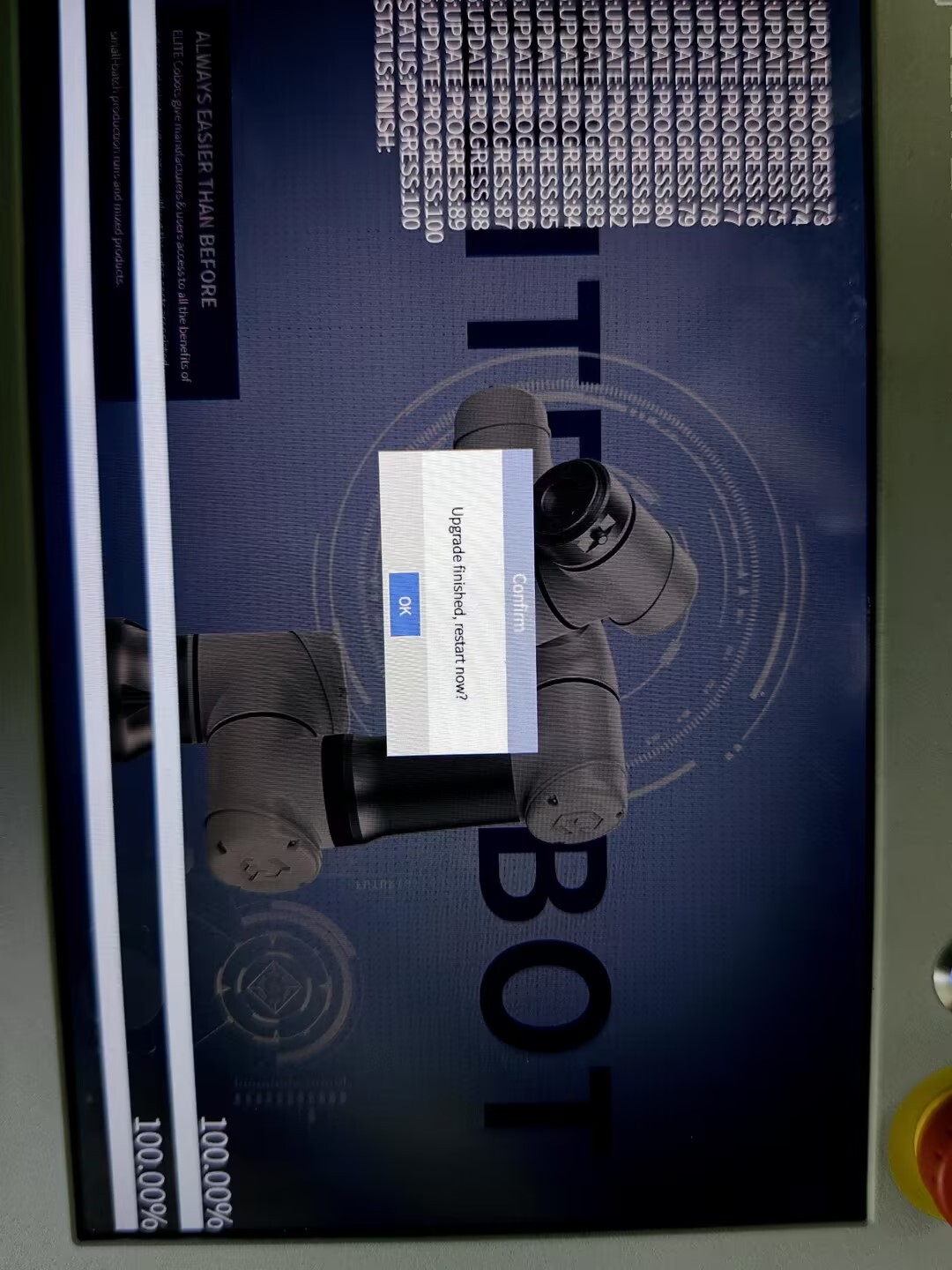 调试阶段建议全部勾选进行升级,也可单独勾选应用升级(应用:系统版本,一般是解决应用软件的bug和界面优化;MCU: 指伺服升级;驱动IO:指末端IO的升级)。点击“是”,会自动进行更新系统;请勿操作机器人或将其断电。等待更新后重启。