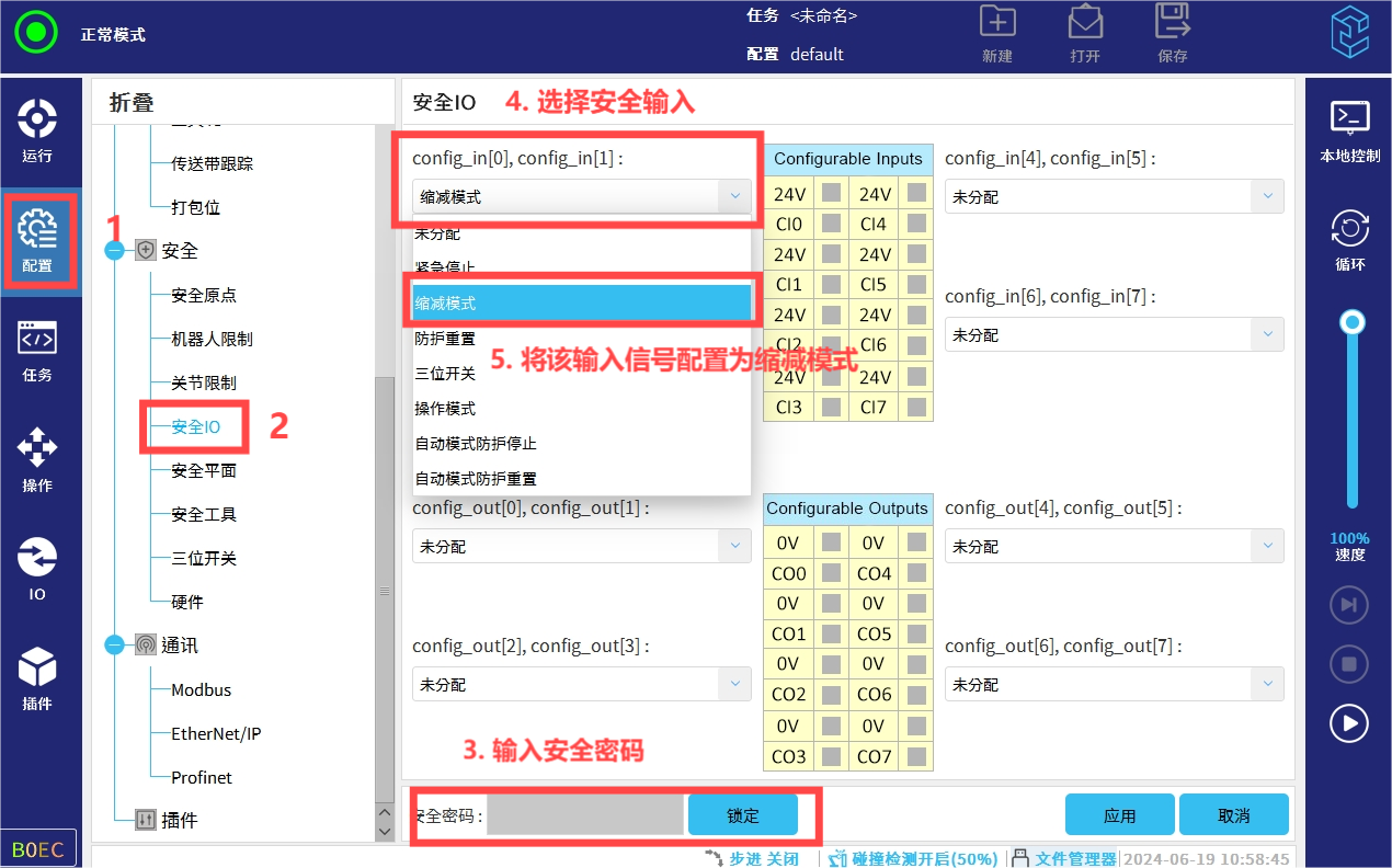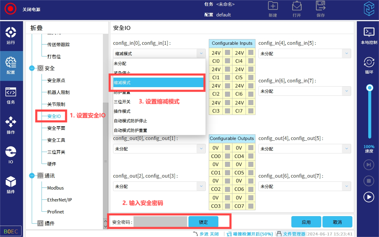 1.   安全输入缩减功能配置,在<配置-----安全io-----安全输入config_in[0~7]-----缩减模式>。该功能的主要作用是外部控制安全输入信号来使机械臂进入缩减模式。选择输入信号为“缩减模式”,低电平有效。当输入信号都为低电平时,机器人为“缩减模式”;当输入信号为一高一低时,机器人会发出安全报警;而都为高电平,机器人为“正常”模式。