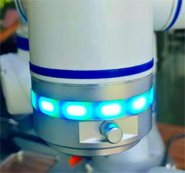 4.  如果机械臂进入缩减模式,右上角会变成黄色指示按钮,机械臂末端法兰指示灯会变为绿蓝交替灯状态。
