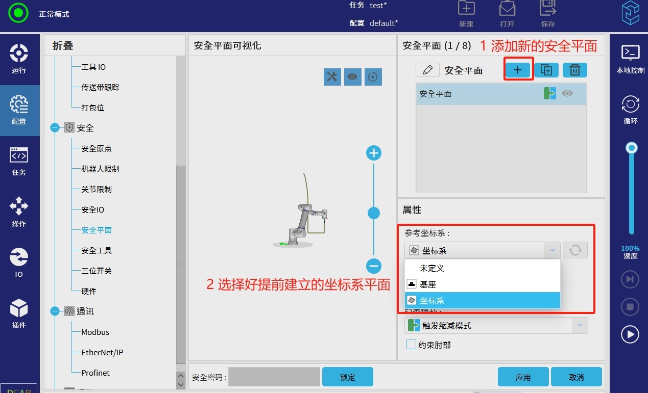 4.  选择好之前建立的坐标系或者基坐标系,通过位置偏移来确定平面位置,该位置偏移是通过增加或者减小该坐标系的Z轴坐标来实现平面位置的偏移。该平面的Z+方向是正常区域,Z-方向是限制区域,机械臂工具中心点到达该平面及该平面Z-方向区域会触发相应的约束模式,缩减模式或者防护停止。如果机械臂进入防护停止,会自动进入安全恢复模式,手动把机械臂的工具中心点移动到Z+方向上面,机械臂才能再次正常使用。