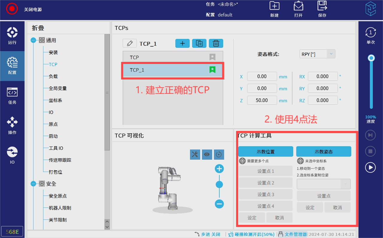 1.  我们在创建安全工具之前首先要建立好正确的TCP工具中心点,在配置-----TCP中创建新的tcp。如下图:
