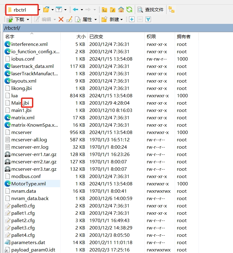 利用FTP软件连接成功之后,在机器人文件系统内,按照下图目录找到rbctrl文件夹